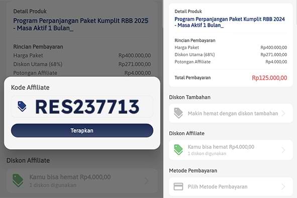 selanjutnya masukkan kode diskon affiliate “RES237713” dan kode diskon